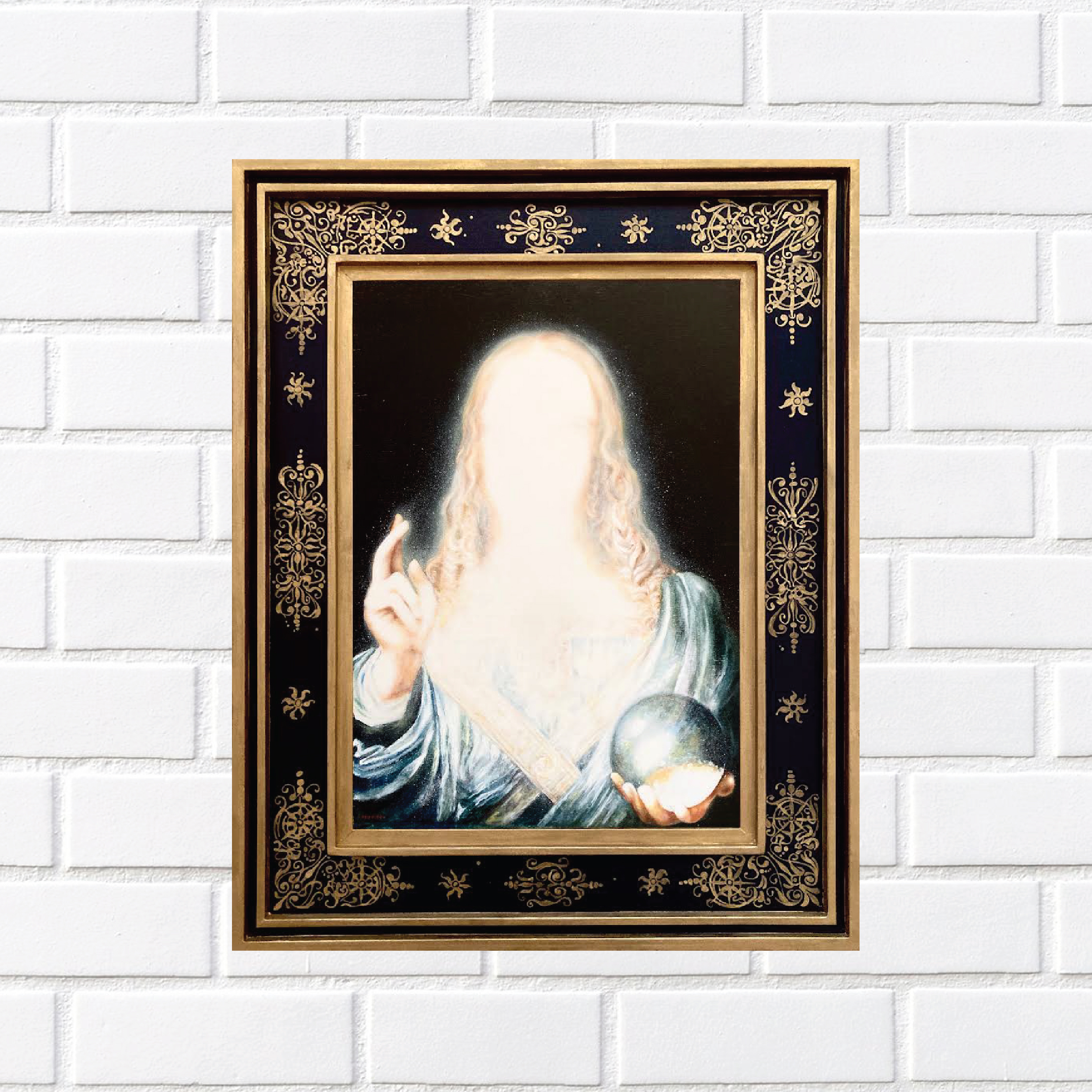 “Salvator Mundi” Menggambarkan sosok Sang juru selamat Yesus Kristus mengenakan gaun renaisans biru anakronistik dan tanda salib di tangan kanannya. Sementara, tangan kirinya memegang bola kristal transparan yang merepresentasikan “bola langit” dari surga yang diklaim sebagai karya Leonardo Da Vinci.
