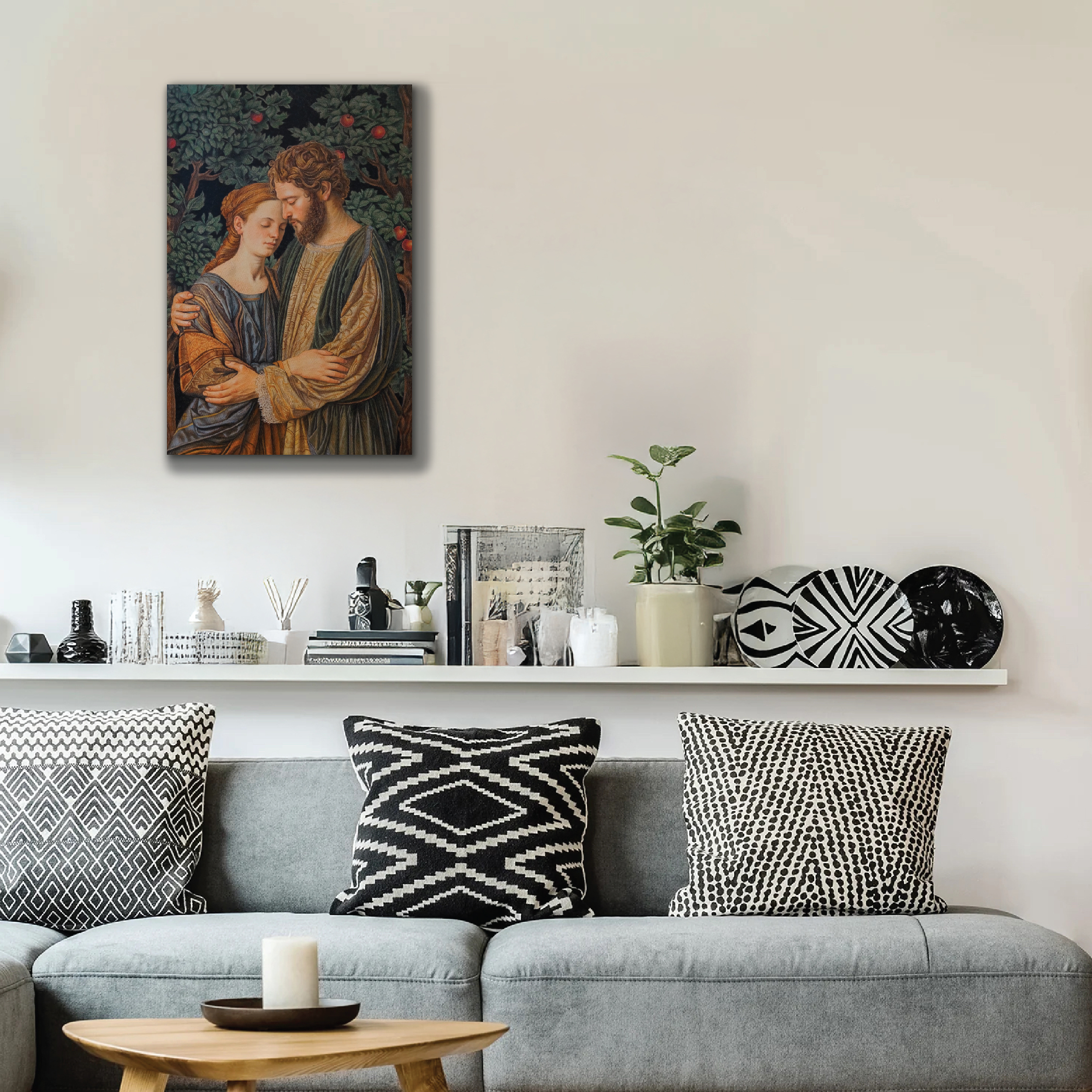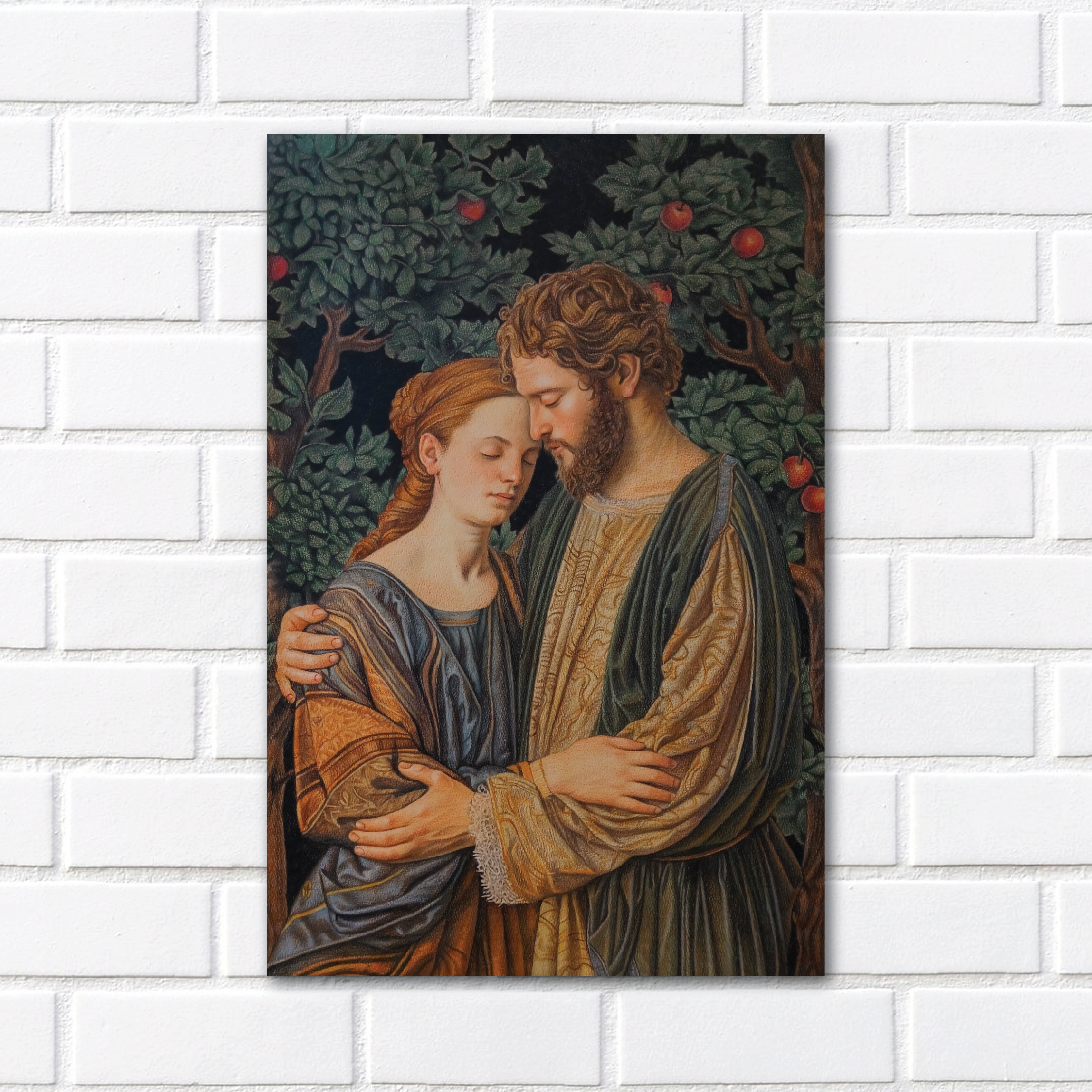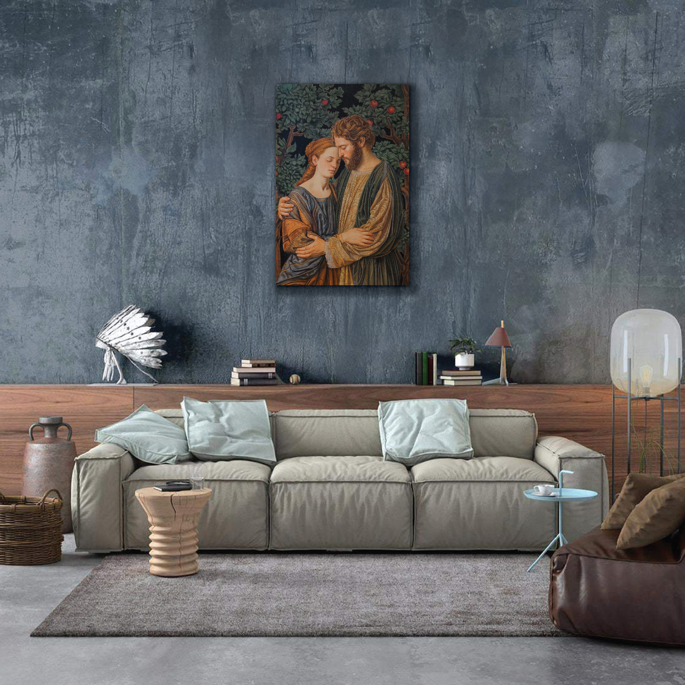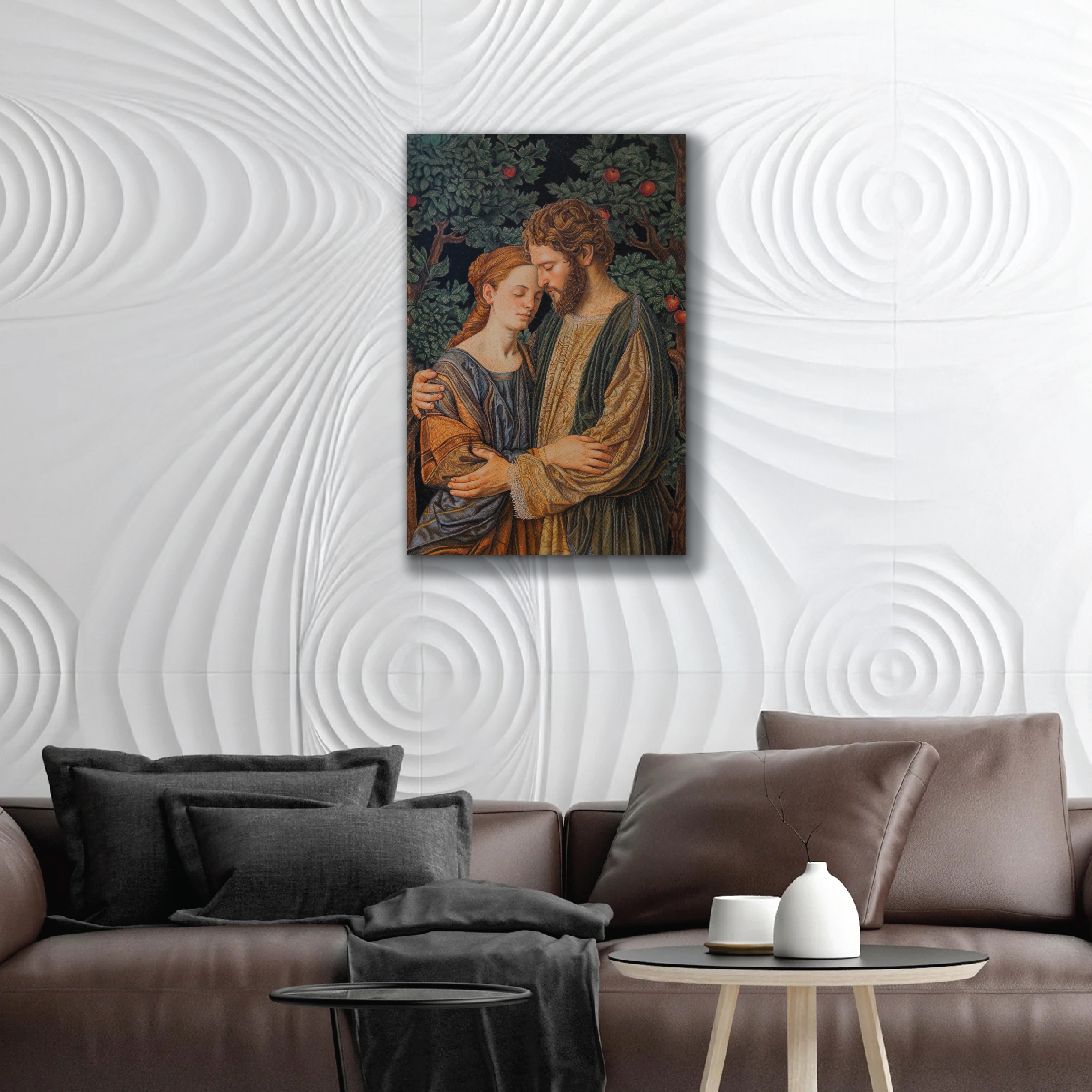 This painting combines elements from various historical tales and timeless mythology. From the love story of Adam and Eve, depicting the origins of humanity and temptation in the Garden of Eden, to the unwavering loyalty of Rama and Sita in the Ramayana epic. The eternal love tragedy of Romeo and Juliet, renowned in world literature, is also reflected in it.